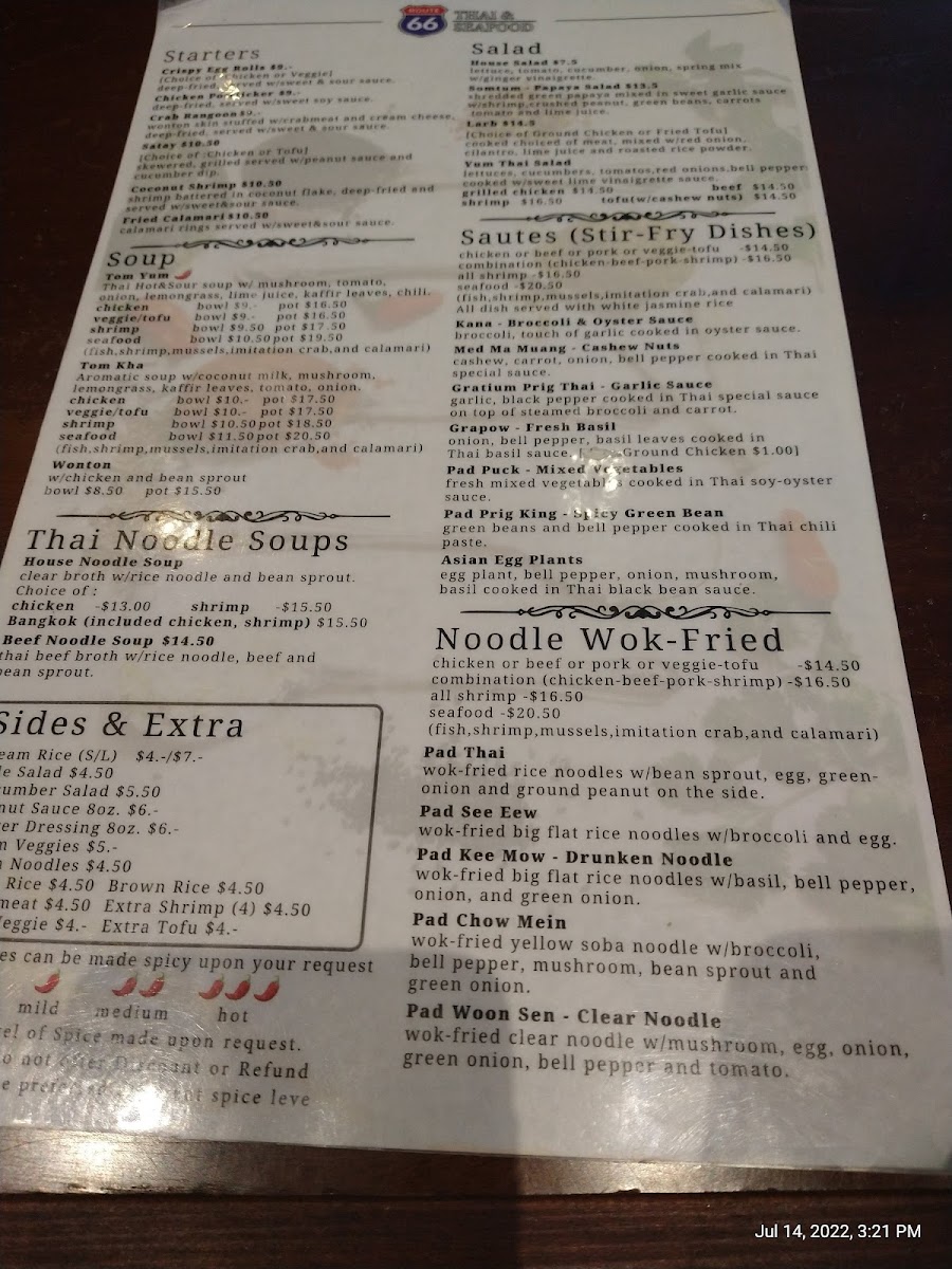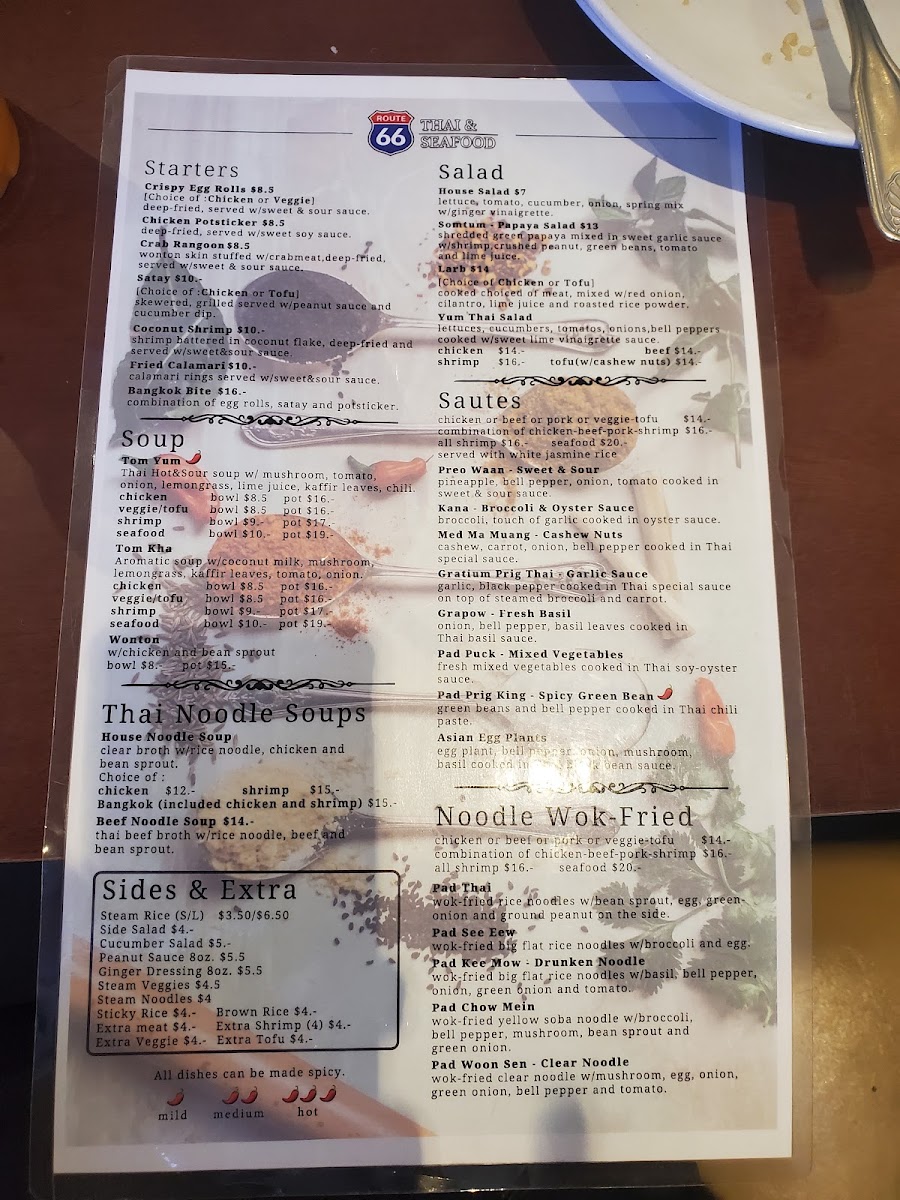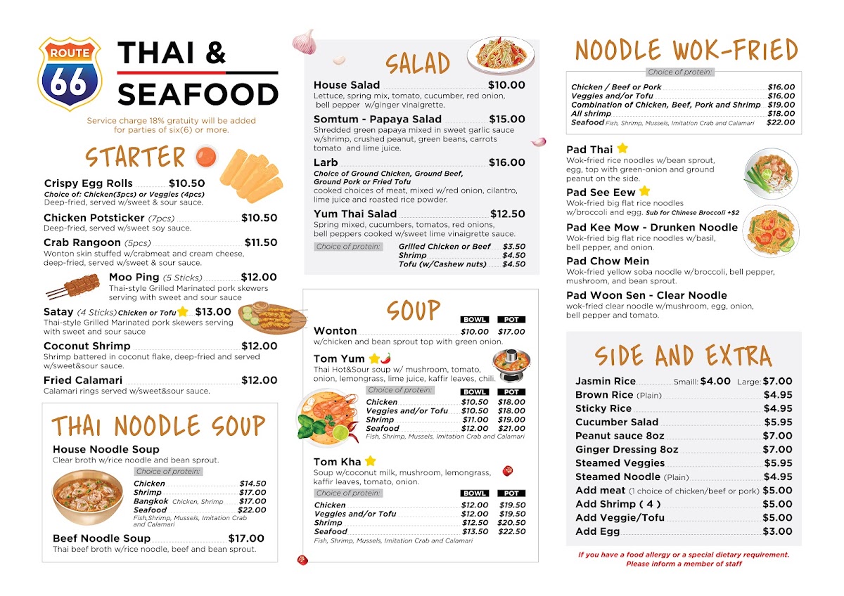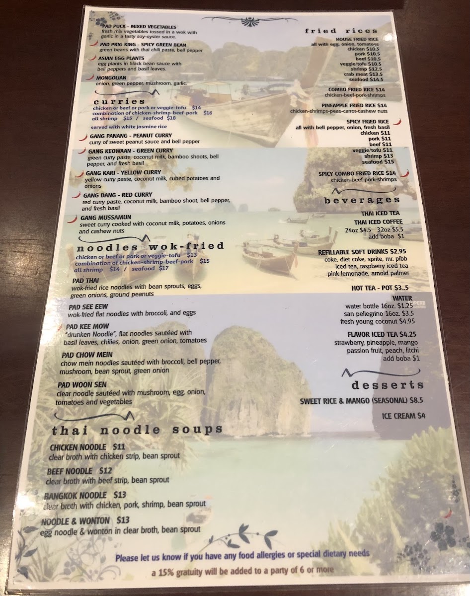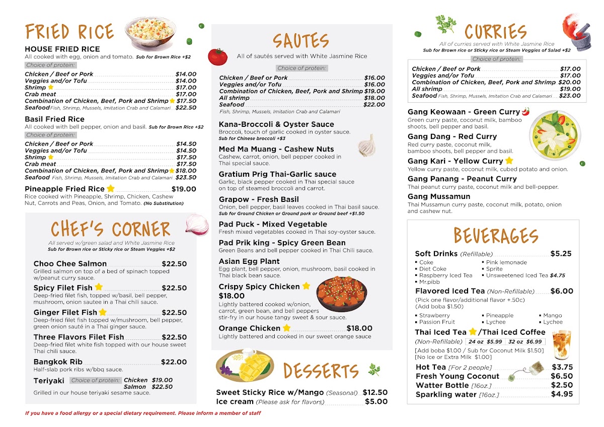 The menu is suitable for casual dining occasions, including lunch or dinner, and offers a range of dishes that accommodate quick orders or more leisurely meals. The diverse categories and familiar Thai dishes accommodate different preferences and dietary considerations.