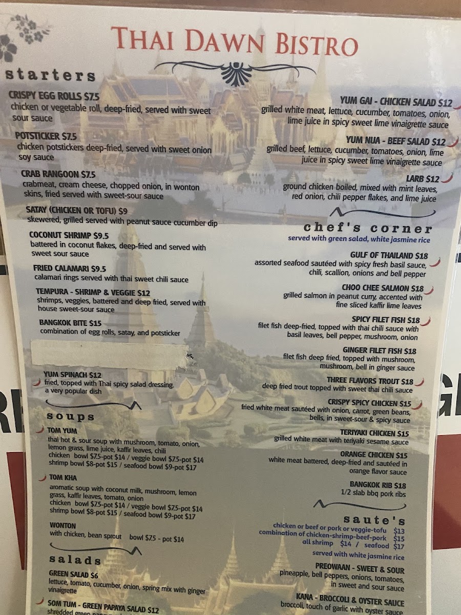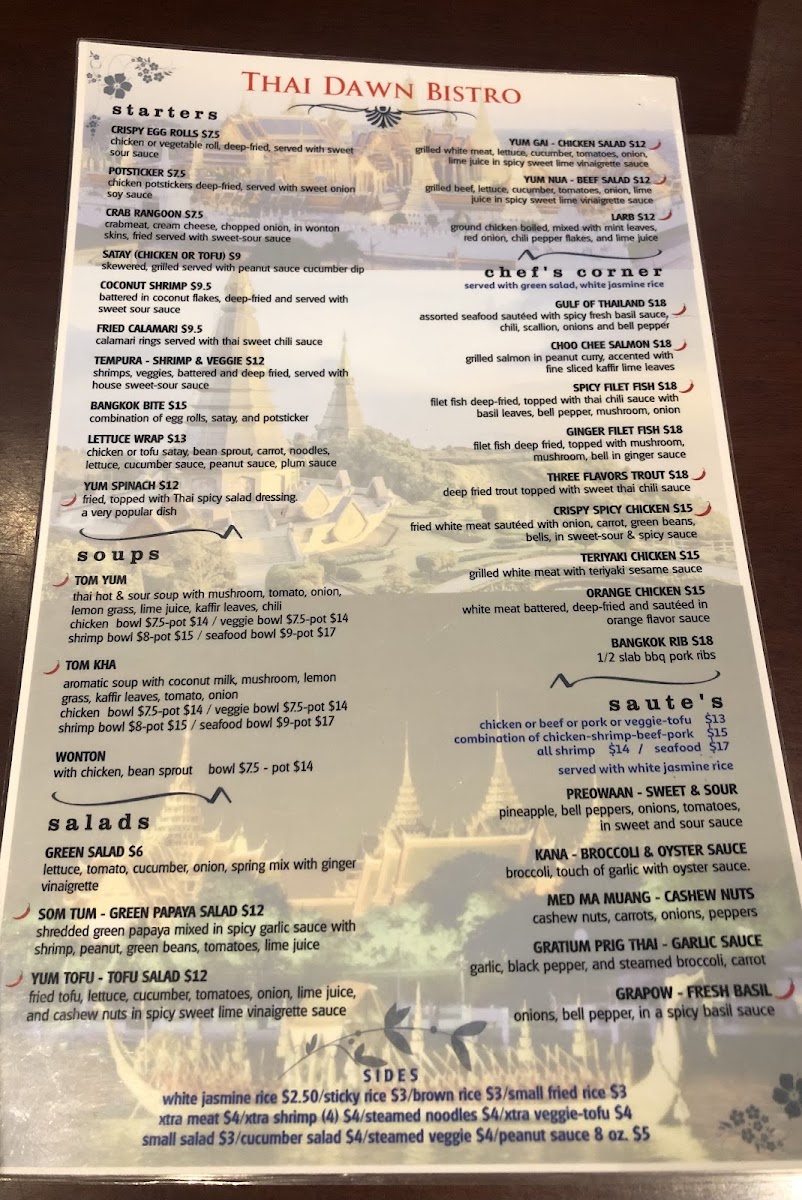 The menu at Thai Dawn Bistro offers a variety of traditional Thai dishes along with popular appetizers, soups, noodles, and desserts. The selections are organized into several key groups, providing a clear overview for visitors looking to explore authentic Thai flavors.