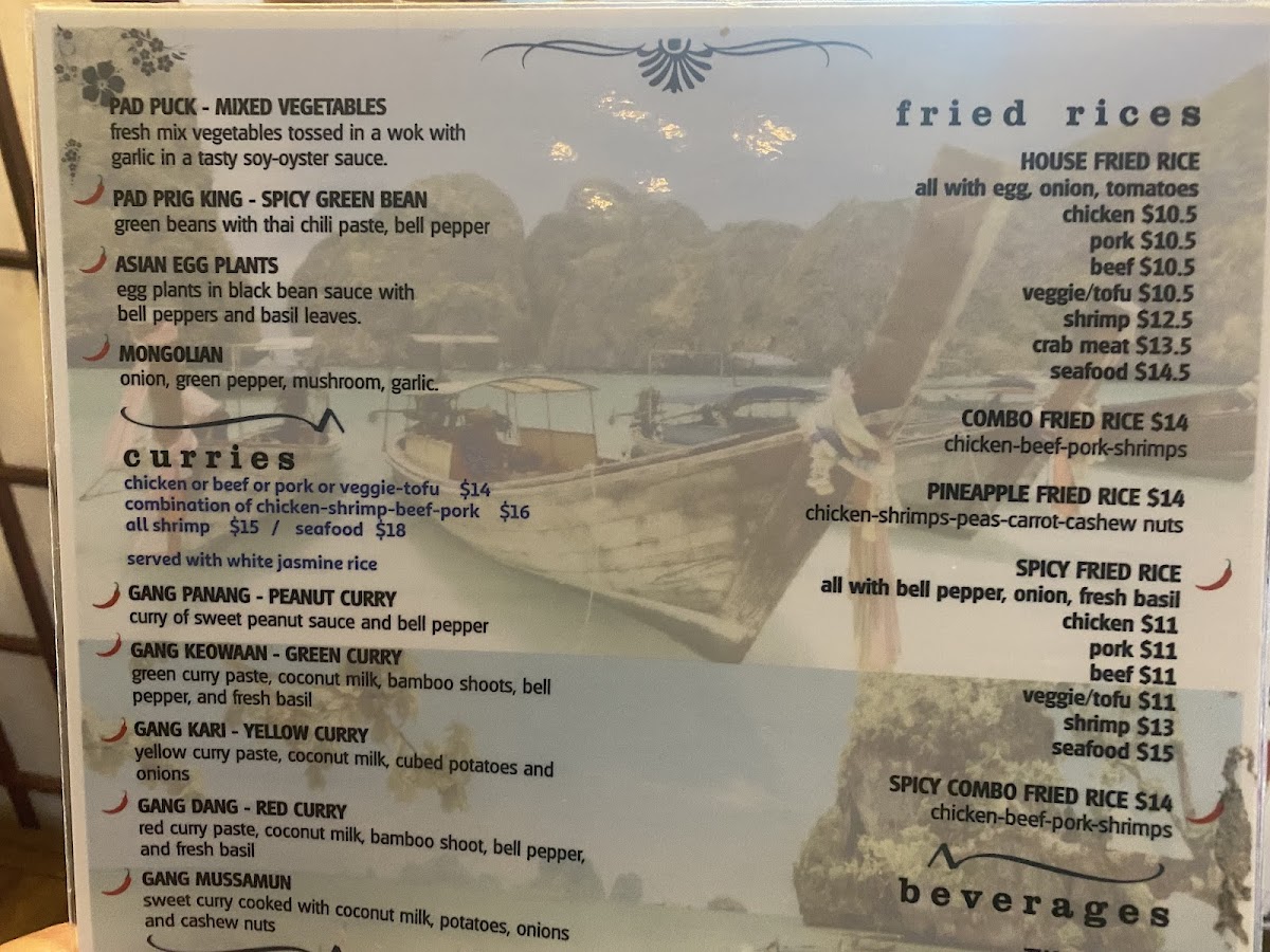 Rice Dishes: Pineapple Fried Rice, Thai Fried Rice, and Spicy Seafood Fried Rice are available, typically served with jasmine rice and various protein additions.